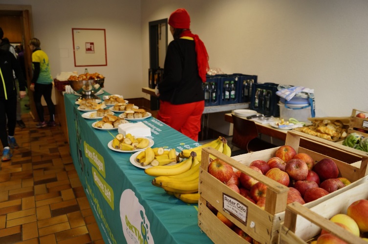 Für Verpflegung ist gesorgt mit Wasser, Säfte, Tee, Teigwaren, Äpfel und natürlich dem Sportlergold: Bananen.