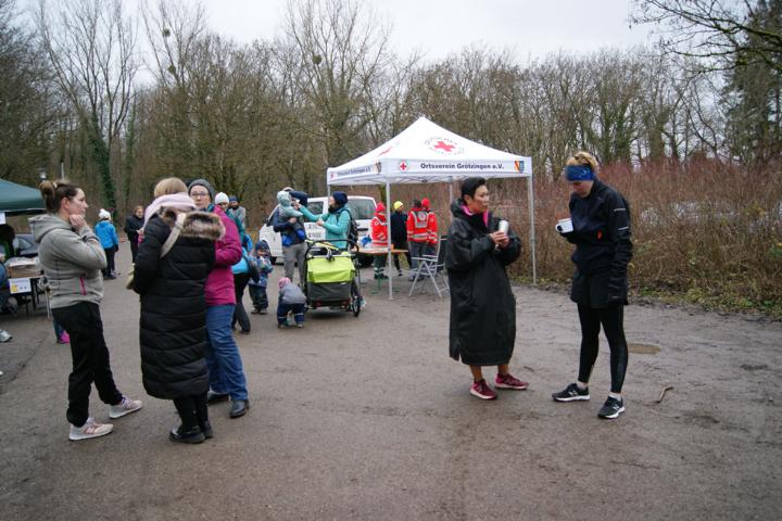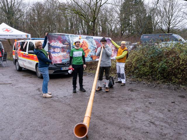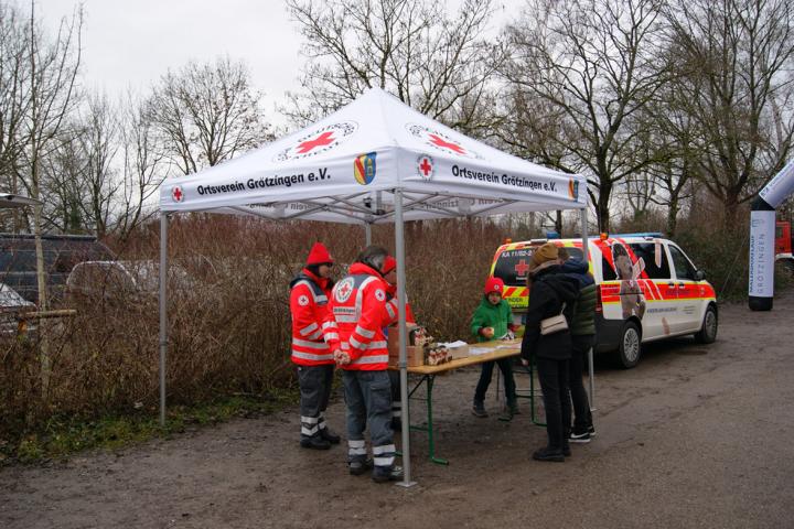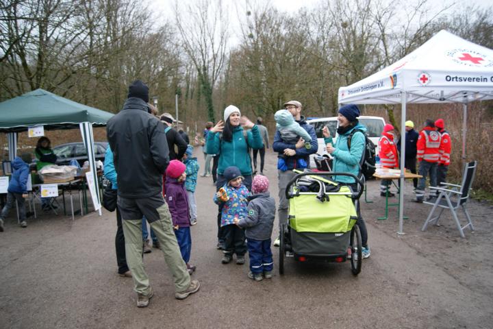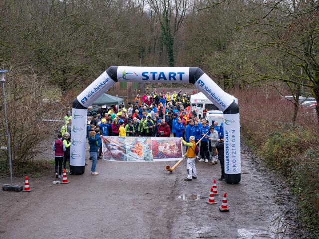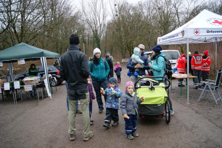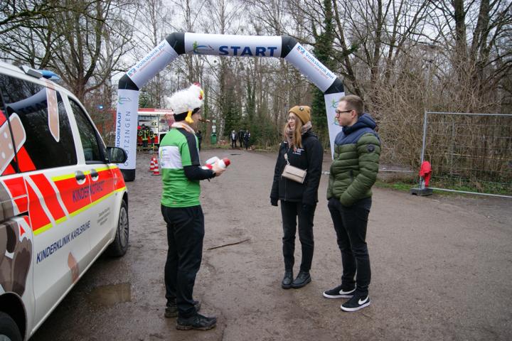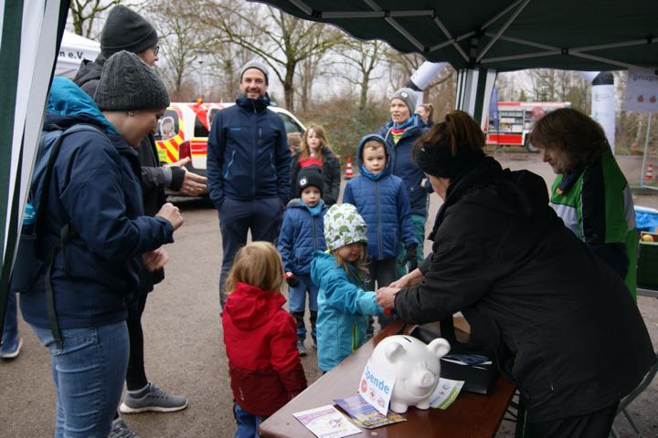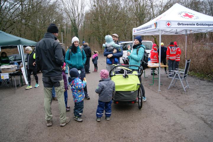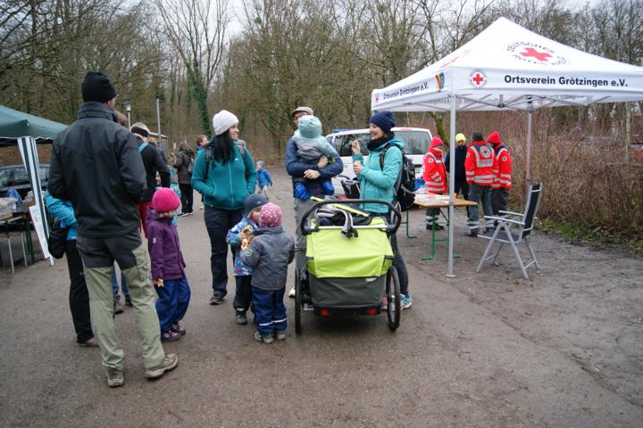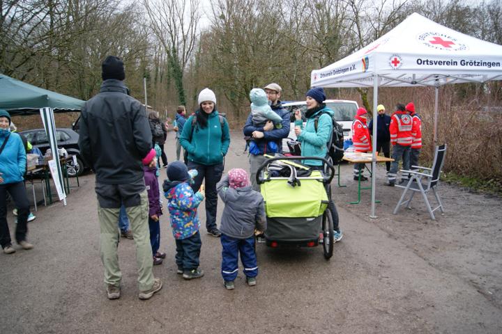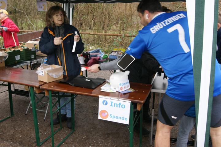 Auf dem Parkplatz Baggersee im Sportzentrum Grötzingen ist der Start-Ziel-Bereich mit Infoständen, Verpflegung und Spendenschwein.
