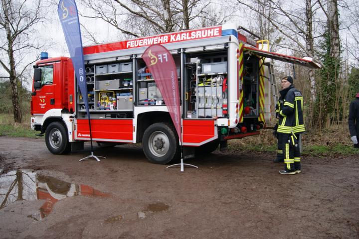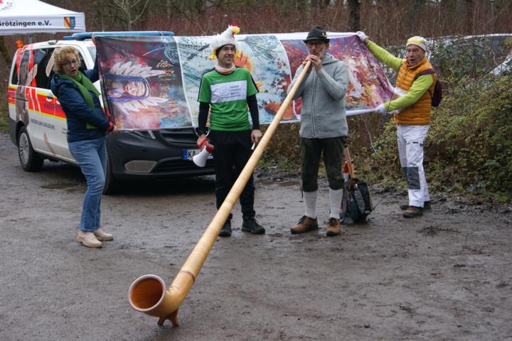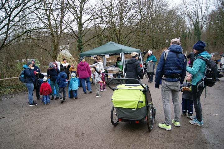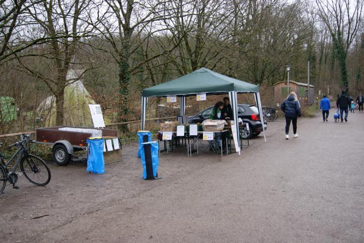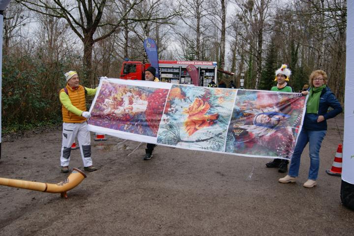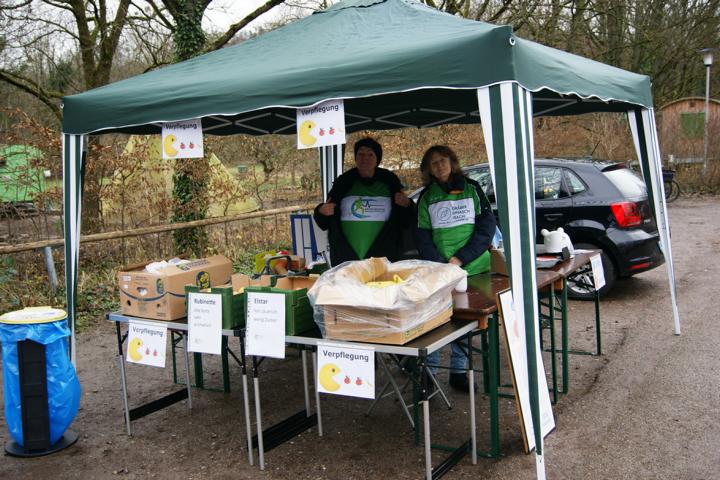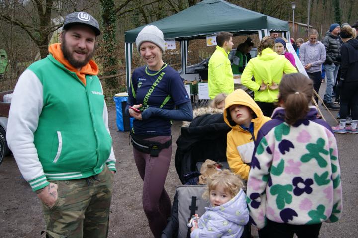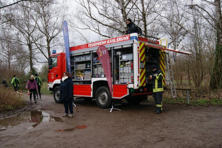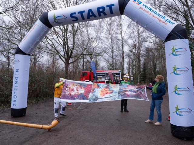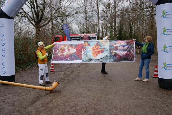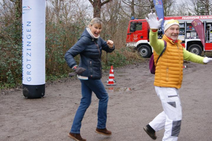 Auf dem Parkplatz Baggersee im Sportzentrum Grötzingen ist der Start-Ziel-Bereich mit Infoständen, Verpflegung und Spendenschwein.